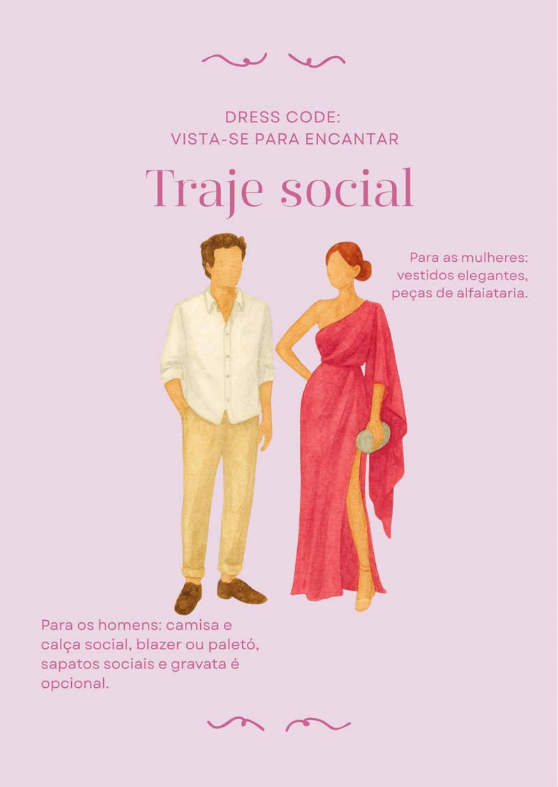 No dia 10/01/2026 para que todos brilhem, pedimos que venham em traje social, e assim, a magia fica ainda mais bonita quando cada detalhe se harmoniza.